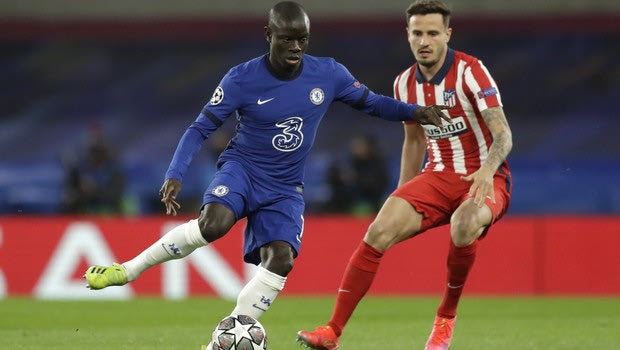 Chelsea's N'Golo Kante, left, is challenged by Atletico Madrid's Saul during the Champions League, round of 16, second leg soccer match between Chelsea and Atletico Madrid at the Stamford Bridge stadium, London, Wednesday, March 17, 2021. (AP Photo/Matt Dunham)