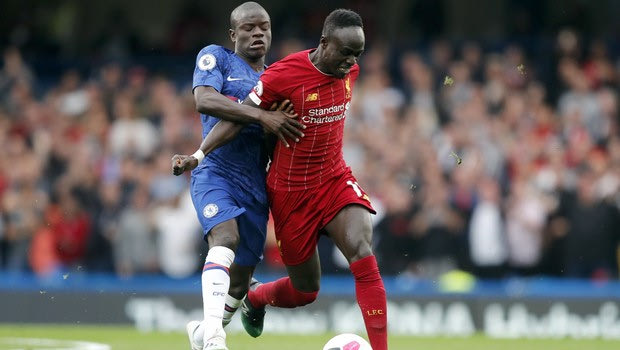 Liverpool's Sadio Mane, right, and Chelsea's N'Golo Kante vie for the ball during the British Premier League soccer match between Chelsea and Liverpool, at the Stamford Bridge Stadium, London, Sunday, Sept. 22, 2019. (AP Photo/Frank Augstein)
