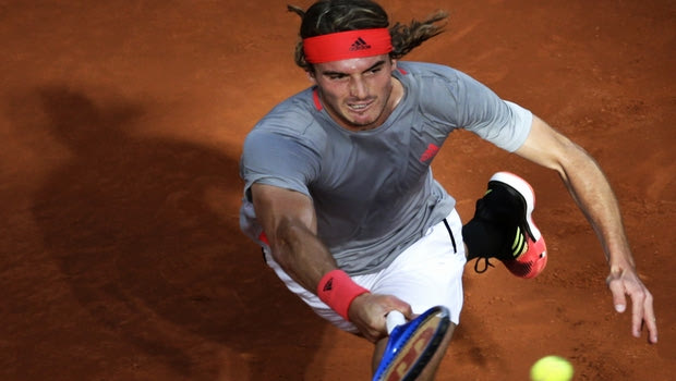 Greece's Stefanos Tsitsipas plays a shot against Serbia's Novak Djokovic during the final of the Madrid Open tennis tournament in Madrid, Spain, Sunday, May 12, 2019. (AP Photo/Bernat Armangue)