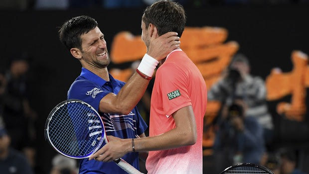 Serbia's Novak Djokovic is congratulated by Russia's Daniil Medvedev, right, after winning their fourth round match at the Australian Open tennis championships in Melbourne, Australia, Tuesday, Jan. 22, 2019. (AP Photo/Andy Brownbill) AP