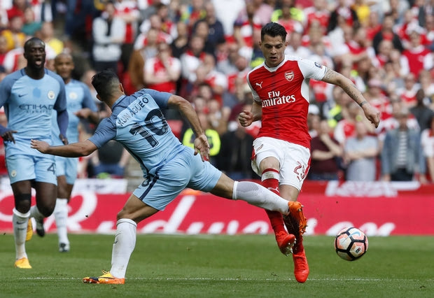Manchester City's Sergio Aguero vies for the ball with Arsenal's Granit Xhaka during the English FA Cup semifinal soccer match between Arsenal and Manchester City at Wembley stadium in London, Sunday, April 23, 2017. (AP Photo/Kirsty Wigglesworth)