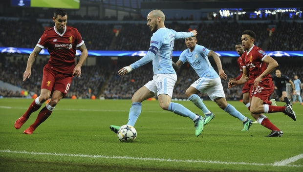 Manchester City's David Silva, center, competes for the ball with Liverpool's Dejan Lovren, left, during the Champions League quarterfinal second leg soccer match between Manchester City and Liverpool at Etihad stadium in Manchester, England, Tuesday, April 10, 2018. (AP Photo/Rui Vieira)