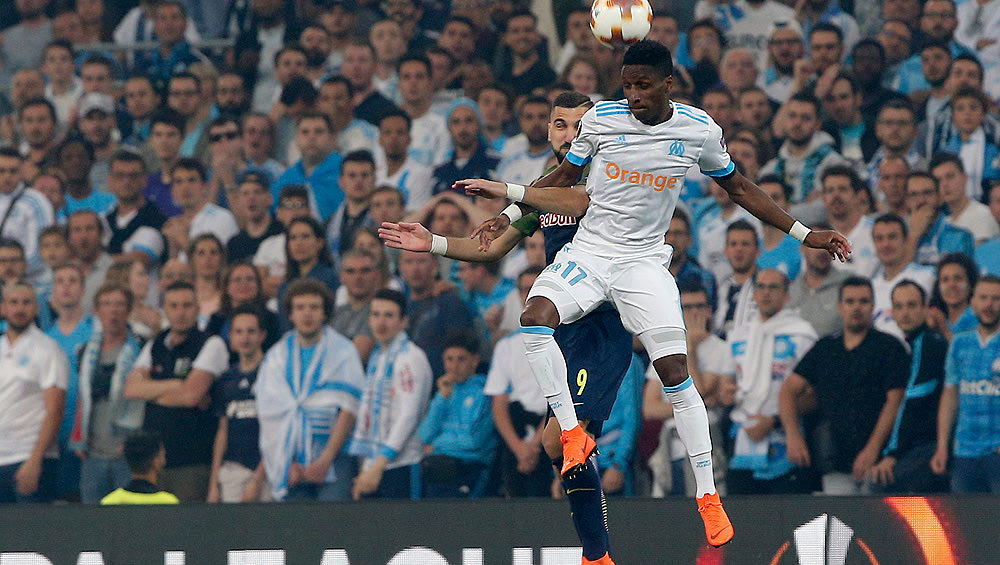 Salzburg's Munas Dabbur, background, and Marseille's Bouna Sarr challenge for the ball during the Europa League semifinal first leg soccer match between Olympique Marseille and RB Salzburg at the Velodrome stadium in Marseille, France, Thursday, April 26, 2018. (AP Photo/Thibault Camus)