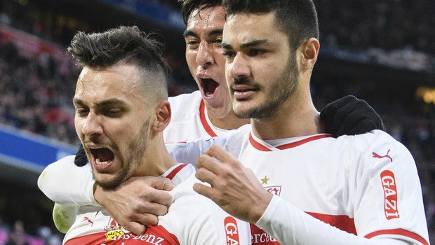Stuttgart's Anastasios Donis, left, celebrates his side's equalizing goal with team mates during a German Bundesliga soccer match between Bayern Munichand VfB Stuttgart in Munich, Sunday, Jan.27, 2019. (Matthias Balk/dpa via AP)