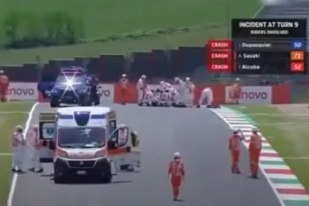 Ο 19χρονος Τζέισον Ντουπασκιέ, ανερχόμενος αστέρας του Moto3, βρέθηκε στο οδόστρωμα αφού προηγουμένως είχε χάσει τον έλεγχο της μηχανής του, η οποία φαίνεται πως τον τραυμάτισε (όπως και η μηχανή άλλου αναβάτη) και τον άφησε αναίσθητο.