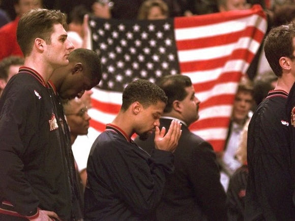 Denver Nuggets guard Mahmoud Abdul-Rauf stands with his teammates and prays during the national anthem before the game with the Chicago Bulls on Friday night, March 15, 1996, in Chicago. Abdul-Rauf, saying that the U.S. flag was a symbol of "oppression and tyranny," was suspended Tuesday for sitting down during the national anthem. Friday was Abdul-Rauf's first game back. The Bulls went on to beat the Nuggets 108-87. (AP Photo/Michael S. Green) ASSOCIATED PRESS
