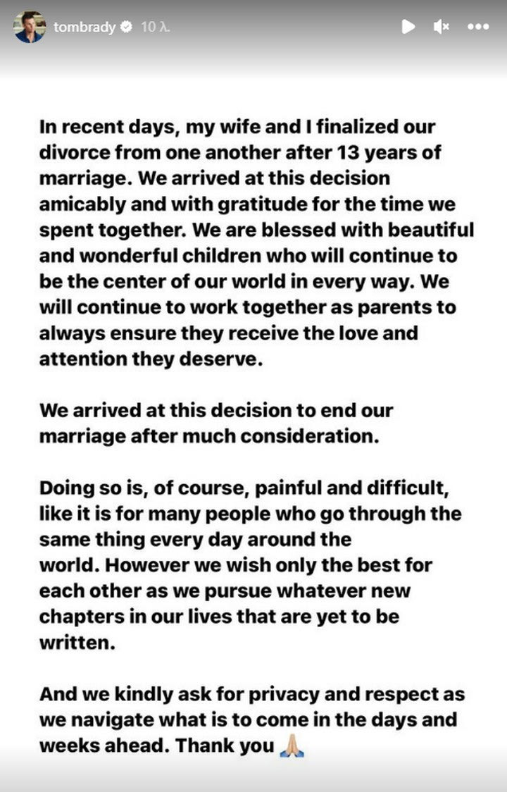 Οι φήμες για το διαζύγιο του Τομ Μπρέιντι με τη Ζιζέλ Μπούντχεν επιβεβαιώθηκαν, με τον πρώτο να ανακοινώνει το γεγονός μέσω των social media.