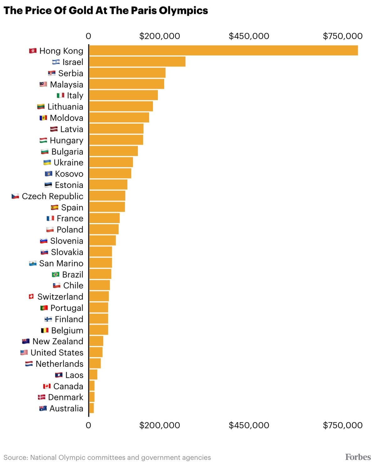 Όπως αναφέρει το Forbes, αν αθλητής του Χονγκ Κονγκ κατακτήσει χρυσό μετάλλιο, θα λάβει 768.000 δολάρια (κάτι περισσότερο από 700.000 ευρώ), ποσό υπερτριπλάσιο από αυτό που προσφέρει το δεύτερο στη σχετική λίστα Ισραήλ (275.000 δολάρια) και η τρίτη Σερβία (218.000 δολάρια). Μαλαισία με 214.000 δολάρια, Ιταλία με 196.000 δολάρια, Λιθουανία με 182.000, Μολδαβία με 171.000, Λετονία με 155.000, Ουγγαρία με 154.000 και Βουλγαρία με 139.000 συμπληρώνουν την πρώτη δεκάδα. Για την ιστορία, οι αθλητές των ΗΠΑ λαμβάνουν μόλις 37.500 δολάρια για την κατάκτηση της κορυφής.