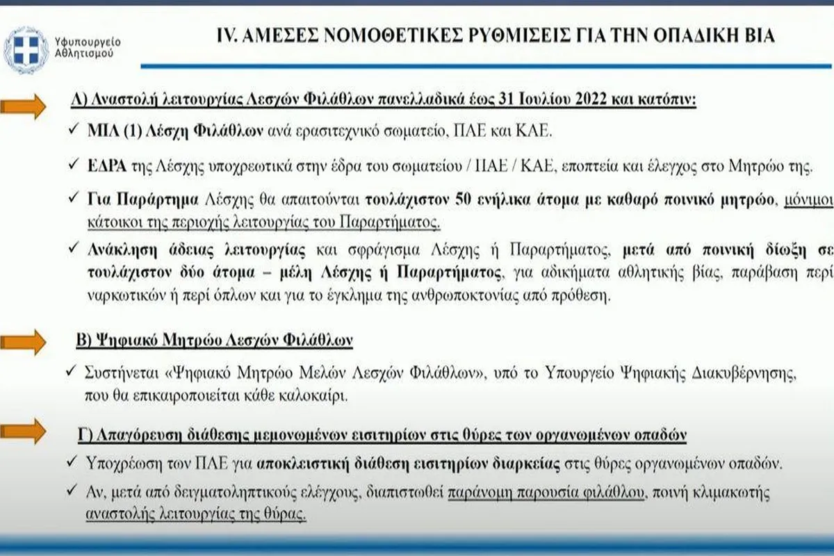 Τα νέα μέτρα που ανήγγειλε η κυβέρνηση για την αντιμετώπιση περιστατικών οπαδικής βίας περιλαμβάνουν και αναστολή λειτουργίας όλων των λεσχών φιλάθλων έως τις 31 Ιουλίου 2022. Όσα θα ισχύουν σύμφωνα με το NEWS24/7.