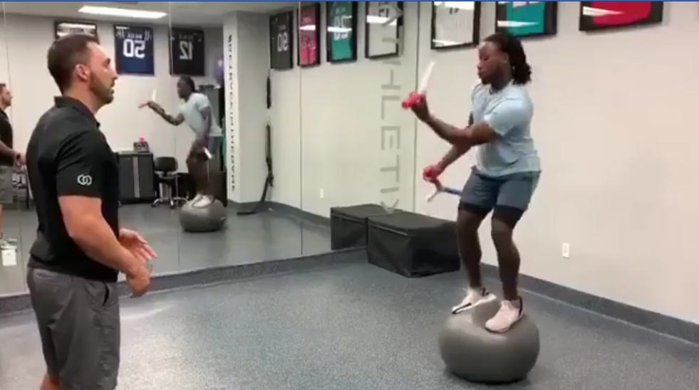 Η παρακάτω άσκηση που κάνει ο Άλβιν Καμαρά των New Orleans Saints είναι ενδεικτική. Πέραν του ότι o 24χρονος running back καταφέρνει και μένει όρθιος πάνω στην μπάλα, είναι σε θέση να πιάνει και τις λαβές που του πετάει ο γυμναστής της ομάδας του.