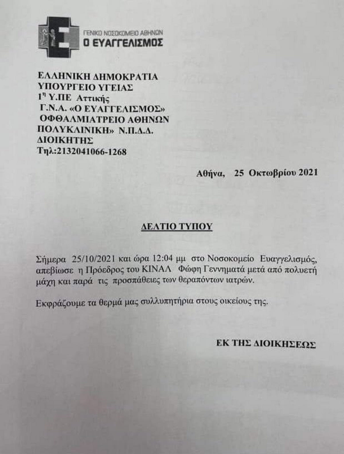 Η γνωστοποίηση του θανάτου της ήρθε από το νοσοκομείο Ευαγγελισμός:“Σήμερα 25/10/2021 και ώρα 12:04 μμ στο Νοσοκομείο Ευαγγελισμός, απεβίωσε η Πρόεδρος του ΚΙΝΑΛ Φώφη Γεννηματά μετά από πολυετή μάχη και παρά τις προσπάθειες των θεραπόντων ιατρών. Εκφράζουμε τα θερμά μας συλλυπητήρια στους οικείους της”.