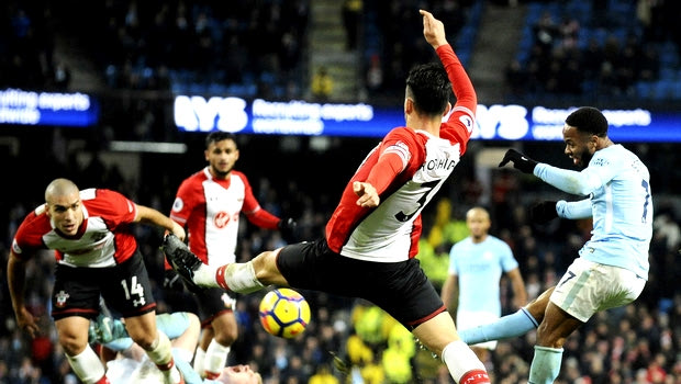Manchester City's Raheem Sterling, right, scores his side second goal during the English Premier League soccer match between Manchester City and Southampton at Etihad stadium, in Manchester, England, Wednesday, Nov. 29, 2017. (AP Photo/Rui Vieira)