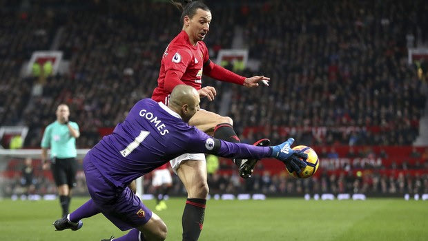 Manchester United's Zlatan Ibrahimovic, background and Watford goalkeeper Heurelho Gomes vie for the ball, during the English Premier League soccer match between Manchester United and Watford, at Old Trafford, in Manchester, England, Saturday, Feb. 11, 2017. (Nick Potts/PA via AP)