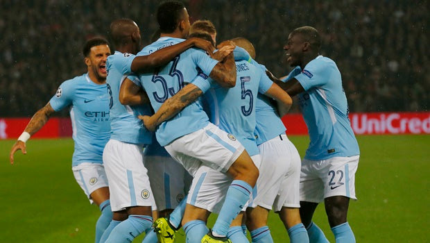 Manchester City players jubilate after scoring during a Champions League Group F soccer match between Feyenoord and Manchester City at the Kuip stadium in Rotterdam, Netherlands, Wednesday, Sept. 13, 2017. (AP Photo/Peter Dejong)