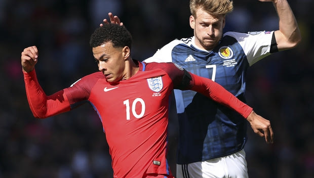 England's Dele Alli, left, vies for the ball with Scotland's Stuart Armstrong during the World Cup Group F qualifying soccer match between Scotland and England at Hampden Park, Glasgow, Scotland, Saturday, June 10, 2017. (AP Photo/Scott Heppell)