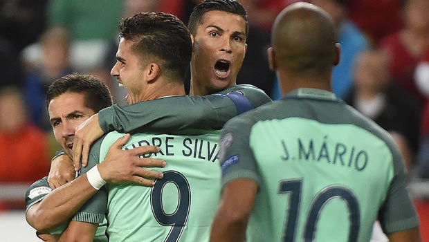Portugal's Cristiano Ronaldo, background centre celebrates Andre Silva's goal with teammates, during the World Cup Group B first round soccer match between Hungary and Portugal, at the Groupama Arena, in Budapest, Hungary, Sunday, Sept. 3, 2017. (Tamas Kovacs//MTI via AP)