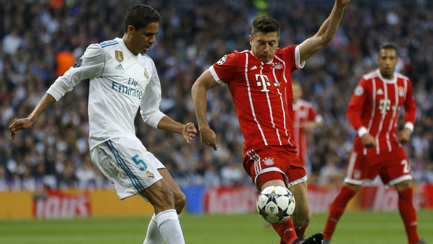 Real Madrid's Raphael Varene, left, and Bayern's Robert Lewandowski challenge for the ball during the Champions League semifinal second leg soccer match between Real Madrid and FC Bayern Munich at the Santiago Bernabeu stadium in Madrid, Spain, Tuesday, May 1, 2018. (AP Photo/Francisco Seco)