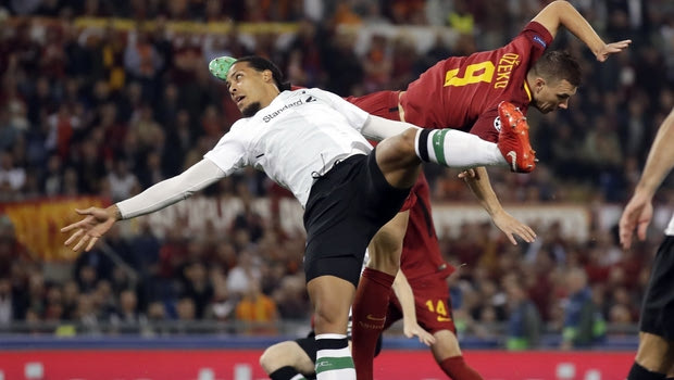 Liverpool's Virgil Van Dijk jumps for the ball with Roma's Edin Dzeko, right, during the Champions League semifinal second leg soccer match between Roma and Liverpool at the Olympic Stadium in Rome, Wednesday, May 2, 2018. (AP Photo/Alessandra Tarantino)
