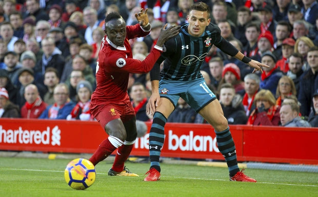 Liverpool's Sadio Mane, left, and Southampton's Dusan Tadic tussle for the ball during the English Premier League soccer match Liverpool versus Southampton at Anfield, Liverpool, England, Saturday Nov. 18, 2017. (Peter Byrne/PA via AP)
