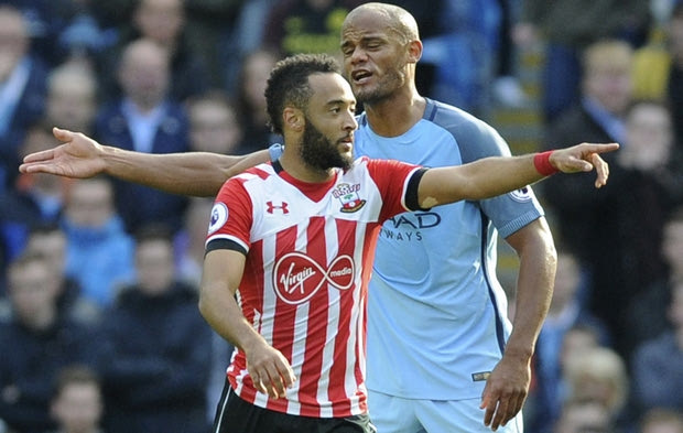 Southampton's Nathan Redmond, foreground, reacts after scoring as Manchester City's Vincent Kompany gestures, during the English Premier League soccer match between Manchester City and Southampton at the Etihad Stadium in Manchester, England, Sunday, Oct. 23, 2016. (AP Photo/Rui Vieira)