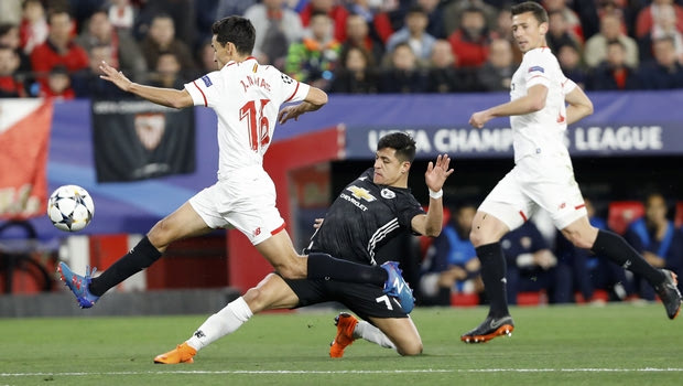 Manchester United's Alexis Sanchez vies for the ball with Sevilla's Jesus Navas, left, during the Champions League round of sixteen first leg soccer match between Sevilla FC and Manchester United at the Ramon Sanchez Pizjuan stadium in Seville, Spain, Wednesday, Feb. 21, 2018. (AP Photo/Miguel Morenatti)