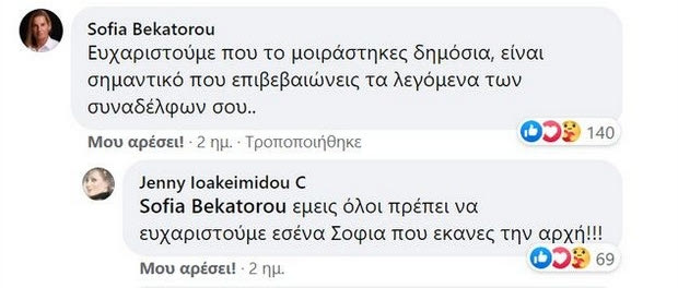 “Ευχαριστούμε που το μοιράστηκες δημόσια, είναι σημαντικό που επιβεβαιώνεις τα λεγόμενα των συναδέλφων σου”, έγραψε η Σοφία Μπεκατώρου, κάτω από τη δημόσια καταγγελία της ηθοποιού στο Facebook, με την Τζένη Ιωακειμίδου να της απαντά: “Εμείς όλοι πρέπει να ευχαριστούμε εσένα Σοφία που έκανες την αρχή”.