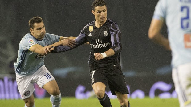 RC Celta's Jonny Castro, left, challenges for the ball with Real Madrid's Cristiano Ronaldo during a Copa del Rey, quarter final, 2nd leg soccer match between Celta and Real Madrid at the Balaidos stadium in Vigo, Spain, Wednesday Jan. 25, 2017. (AP Photo/Lalo R. Villar)
