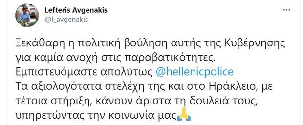 Τα αξιολογότατα στελέχη της ΕΛ.ΑΣ. και στο Ηράκλειο, με τέτοια υποστήριξη, κάνουν άριστα τη δουλειά τους, υπηρετώντας την κοινωνία μας και τα ευχαριστούμε θερμά”.