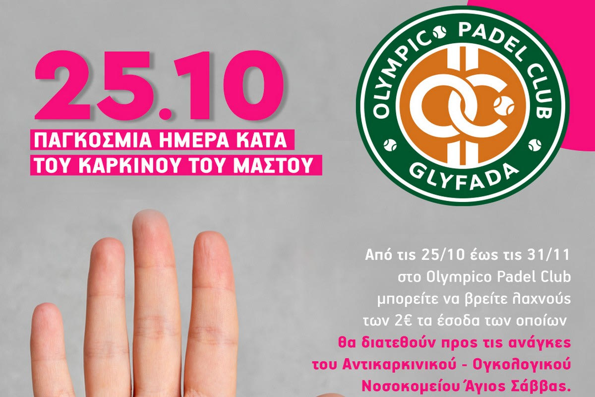 Από τη Δευτέρα έως και την Κυριακή στο Οlympico Padel Club θα πωλούνται λαχνοί των 2€ τα έσοδα των οποίων θα διατεθούν προς τις ανάγκες του του Αντικαρκινικού – Ογκολογικού Νοσοκομείου Άγιος Σάββας.