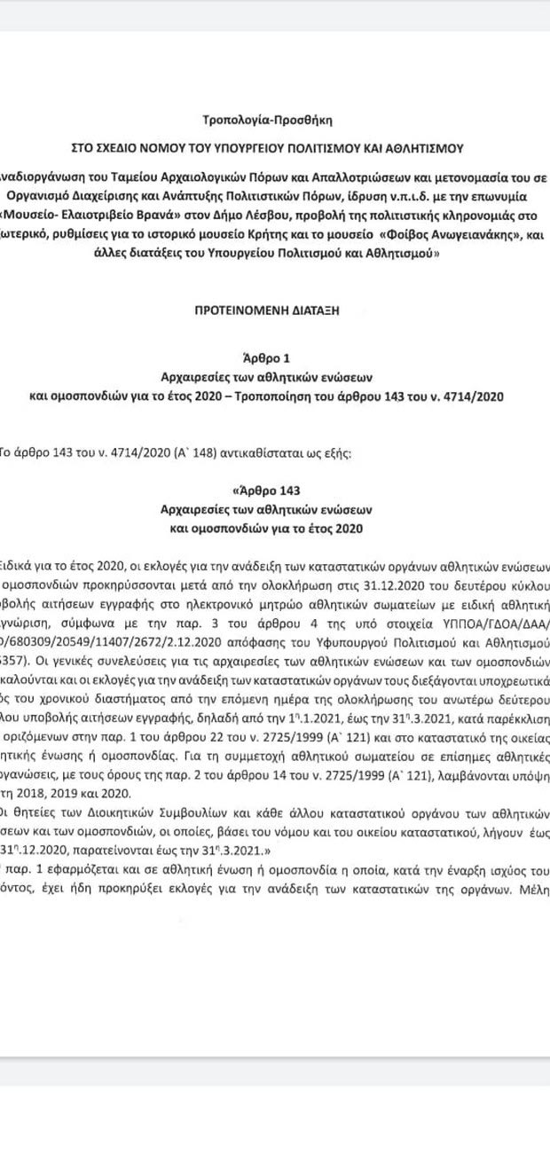 Τροπολογία για τις εκλογές των Ομοσπονδιών από 1/1 ως 31/3, εξαιρείται η ΕΠΟ