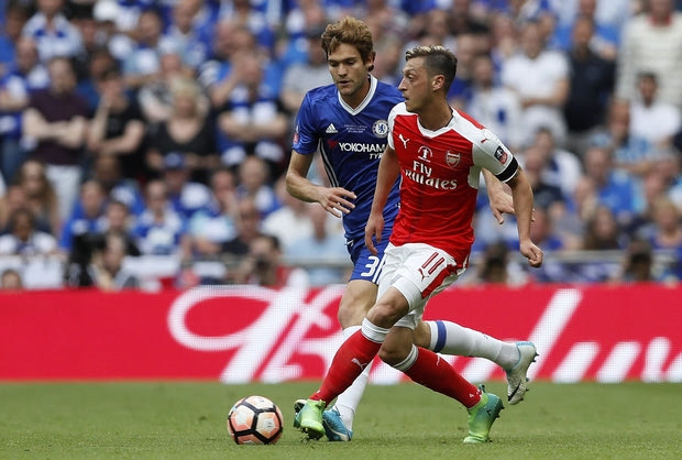 Arsenal's Mesut Ozil, right, controls the ball in front of Chelsea's Marcos Alonso during the English FA Cup final soccer match between Arsenal and Chelsea at Wembley stadium in London, Saturday, May 27, 2017. (AP Photo/Kirsty Wigglesworth)