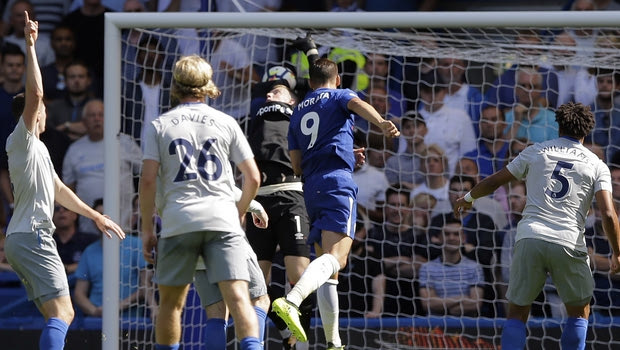 Chelsea's Alvaro Morata, center, scores his side's second goal past Everton goalkeeper Jordan Pickford, center left, during the English Premier League soccer match between Chelsea and Everton at Stamford Bridge stadium in London, Sunday, Aug. 27, 2017. (AP Photo/Alastair Grant)