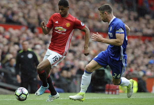 Manchester United's Marcus Rashford, left, and Chelsea's Gary Cahill challenge for the ball during the English Premier League soccer match between Manchester United and Chelsea at Old Trafford stadium in Manchester, Sunday, April 16, 2017.(AP Photo/ Rui Vieira)