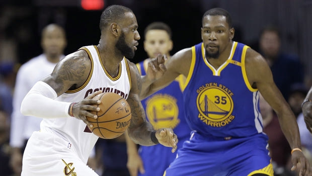 FILE - In this Friday, June 9, 2017 file photo, Cleveland Cavaliers forward LeBron James (23) drives on Golden State Warriors forward Kevin Durant (35) during the second half of Game 4 of basketball's NBA Finals in Cleveland. The Golden State Warriors were the last team standing when the NBA season closed in June. Thanks to a preseason trip to China, they are one of the first teams to get going this season as the league gets up and rolling again. (AP Photo/Tony Dejak, File)