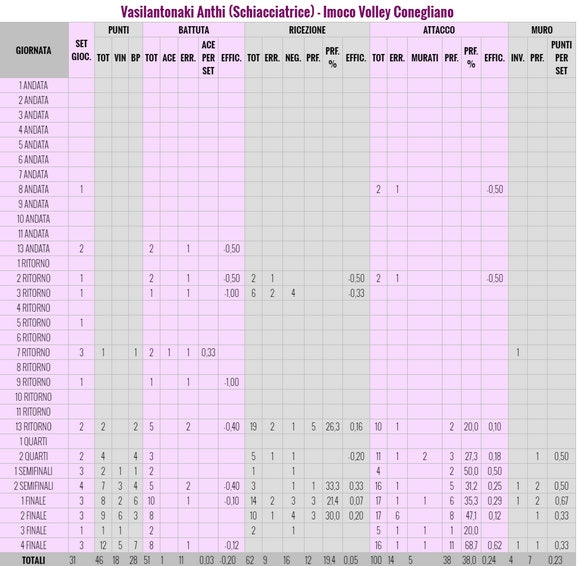 Στα 20της χρόνια η Ελληνίδα αθλήτρια βούτηξε στα βαθιά στα πλέι οφ του ιταλικού πρωταθλήματος και επιβεβαίωσε όσους πιστεύουν ότι θα αφήσει εποχή στο ελληνικό βόλεϊ. Είναι χαρακτηριστικό ότι μέσα στη χρονιά αγωνιστική ελάχιστα αλλά στα πλέι οφ έβαλε και εκείνη το δικό της λιθαράκι στην κατάκτηση του πρωταθλήματος.