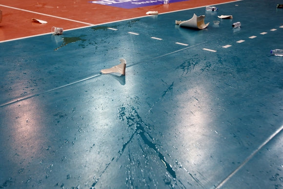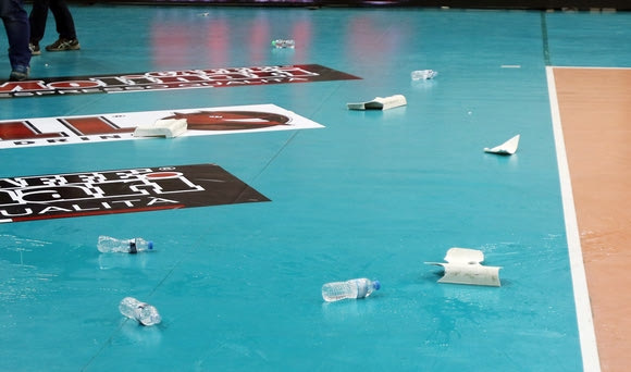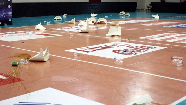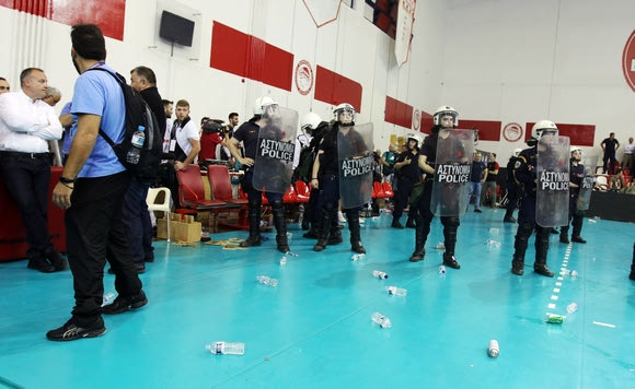 Μόλις ολοκληρώθηκε ο πέμπτος τελικός στο "Μελίνα Μερκούρη", οι οπαδοί του Ολυμπιακού πέταξαν στον αγωνιστικό χώρο αντικείμενα, αναψυκτικά και καρεκλάκια. Δείτε εικόνες.