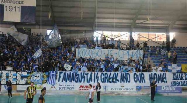 Πριν την έναρξη της αναμέτρησης, υποδέχθηκαν τους Τούρκους με χίλιες ελληνικές σημαίες, αλλά και μ’ ένα τεράστιο πανό που απεικόνιζε το κατεχόμενο Βαρώσι, μία συνοικία της Αμμοχώστου, αλλά και το μήνυμα “Λευτεριά στην Αμμόχωστο”.