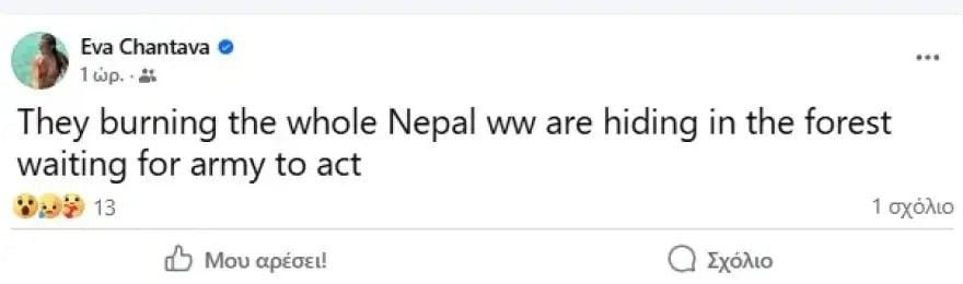 Μέσω αναρτήσεων, η Εύα Χαντάβα δήλωσε πως βρίσκεται σε κίνδυνο: “Καίνε ολόκληρο το Νεπάλ. Κρυβόμαστε στο δάσος και περιμένουμε τον στρατό να επέμβει. Δεν είμαι ασφαλής τώρα”, έγραψε η αθλήτρια.