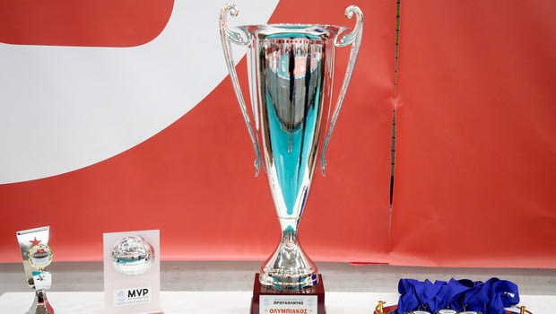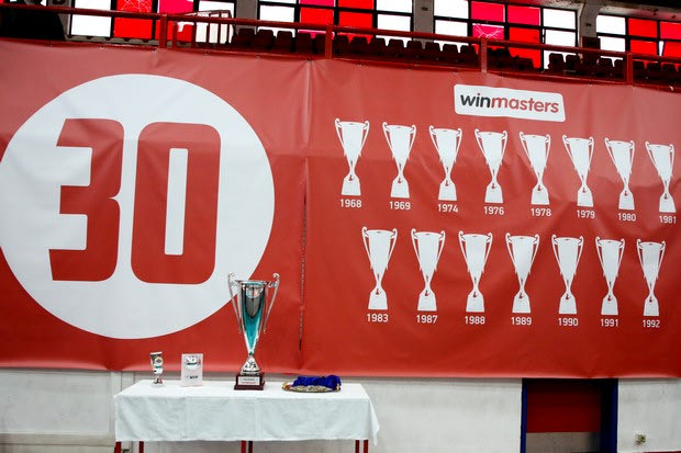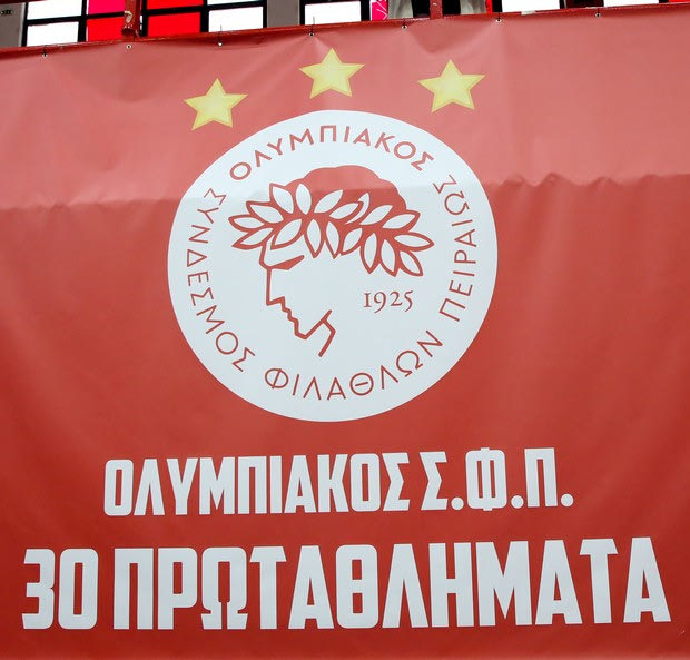 Η κούπα του πρωταθλητή και το πανό για τα 30 πρωταθλήματα του Ολυμπιακού
