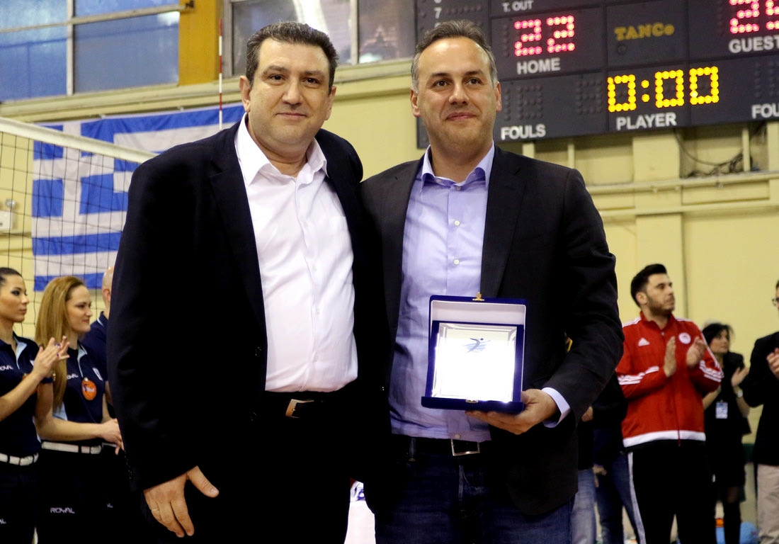 Στη φωτό ο πρόεδρος της ΕΟΠΕ, Αχιλλέας Μαυρομάτης με τον δήμαρχο Γλυφάδας, Γιώργο Παπανικολάου, ο οποίος τιμήθηκε από την Ομοσπονδία για τη συνεισφορά του στη φετινή συνδιοργάνωση του Κυπέλλου Ελλάδας 2016.