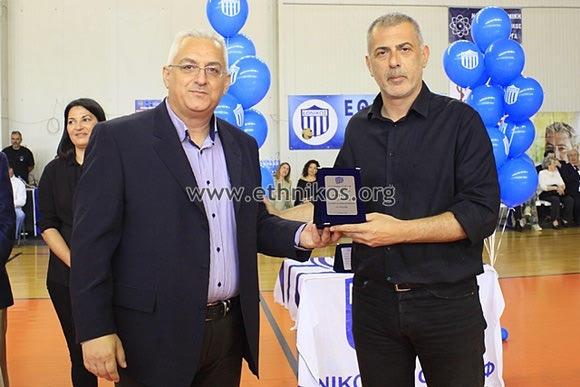 * Ο υπεύθυνος του τμήματος βόλεϊ του Εθνικού μαζί με το Δήμαρχο Πειραιά, Γιάννη Μώραλη.