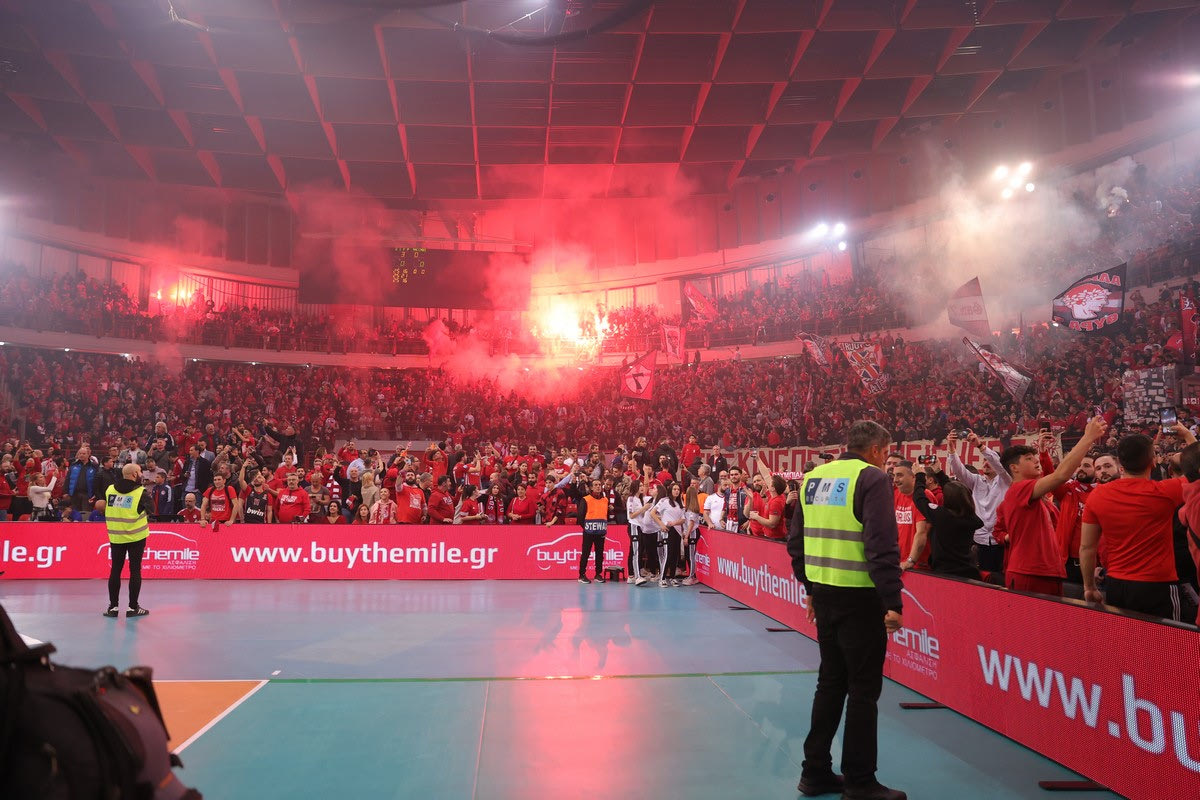 Οι ερυθρόλευκοι είχαν την ένθερμη συμπαράσταση των φιλάθλων τους που δημιούργησαν εντυπωσιακή ατμόσφαιρα και γέμισαν το ΣΕΦ.
