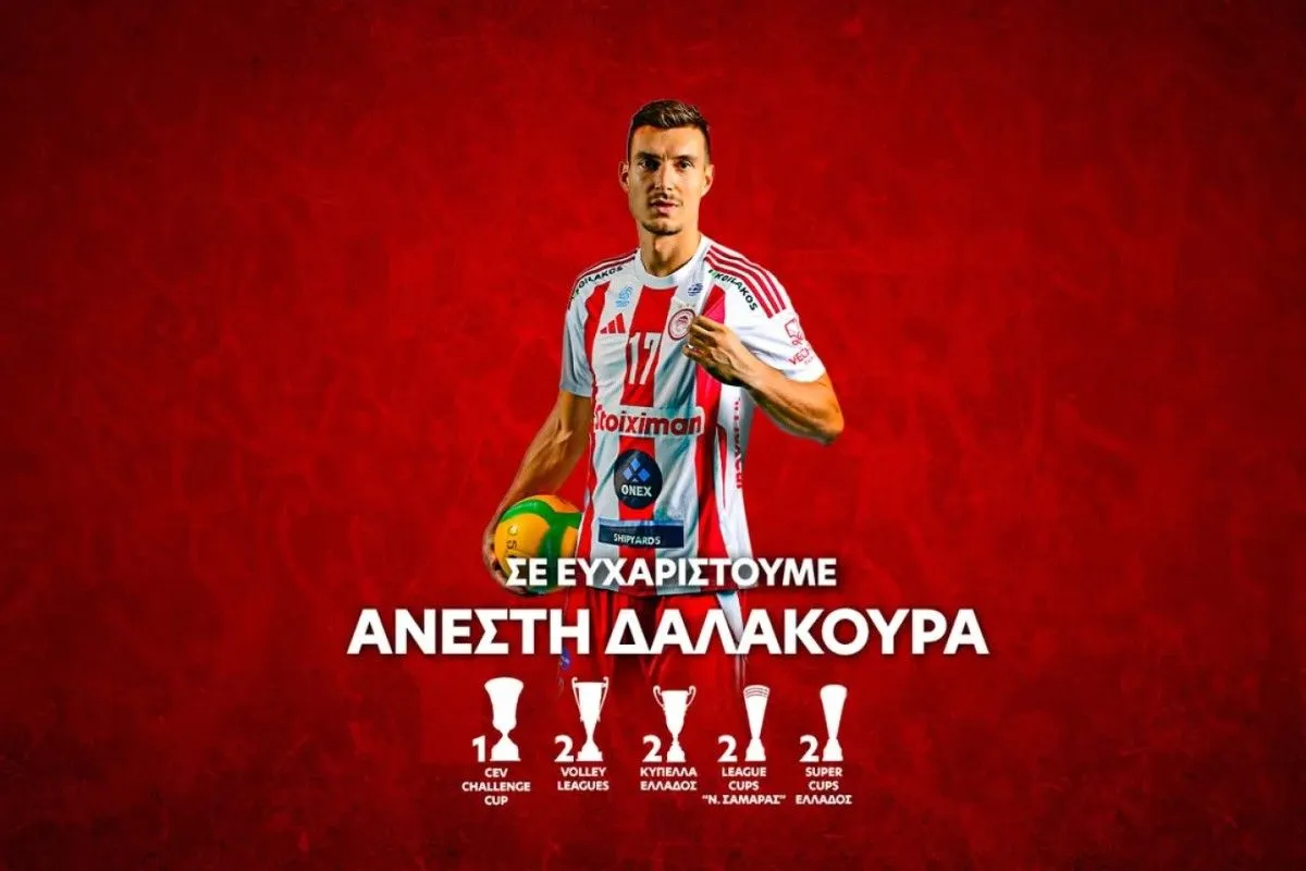 “Ο ΟΛΥΜΠΙΑΚΟΣ Σ.Φ.Π. ευχαριστεί θερμά τον Ανέστη Δαλακούρα για την πολύτιμη προσφορά του στην ομάδα βόλεϊ Ανδρών του συλλόγου. Ο Ανέστης Δαλακούρας ολοκληρώνει την αγωνιστική του πορεία, αφήνοντας πίσω του μια σημαντική παρακαταθήκη ήθους, αφοσίωσης και επιτυχιών.
