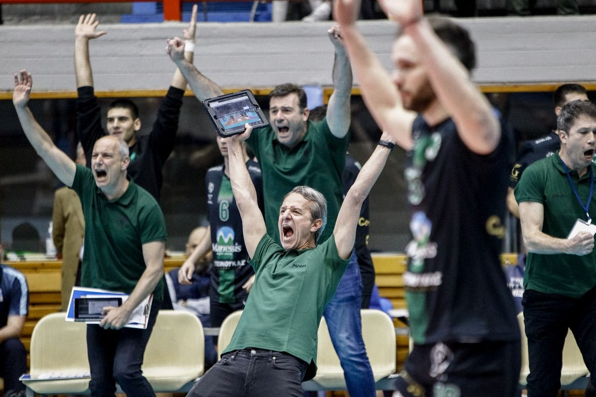 Οι πανηγυρισμοί στον πάγκο του Μίλωνα μετά την πρόκριση στον τελικό του Κυπέλλου βόλεϊ ανδρών