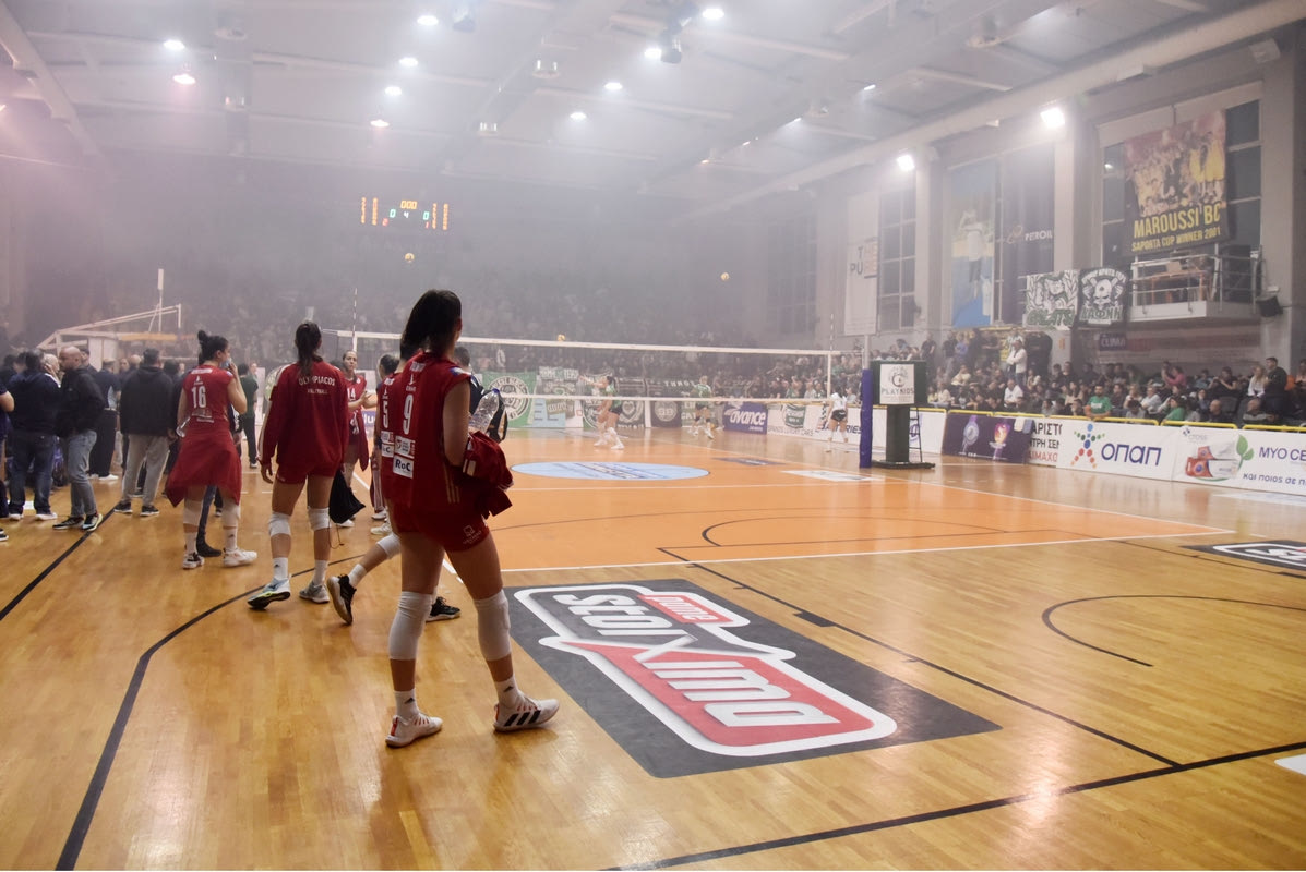 Ο Παναθηναϊκός επικράτησε 3-1 σετ του Ολυμπιακού στον πρώτο τελικό της Volley League γυναικών με τη διακοπή περίπου μιας ώρας και την εκκένωση του γηπέδου να σημαδεύουν την αναμέτρηση.