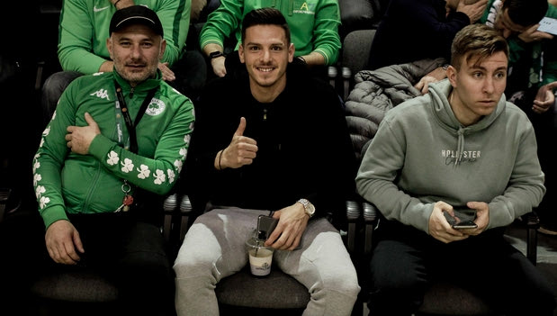 Εκπρόσωπος στο μεγάλο παιχνίδι υπάρχει και από τον ποδοσφαιρικό Παναθηναϊκό, αφού την αναμέτρηση παρακολουθεί και ο εξτρέμ των “πρασίνων”, Τάσος Χατζηγιοβάνης.