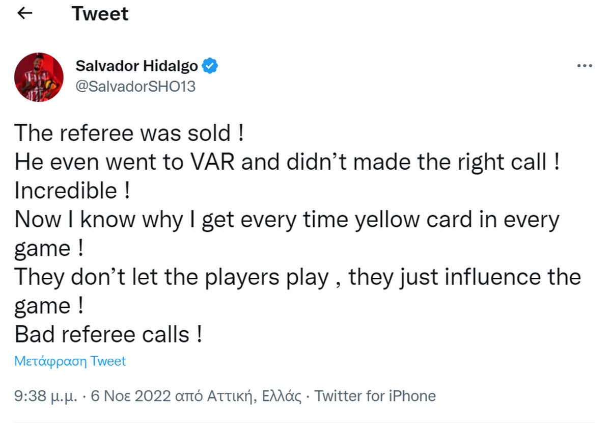 “Ο διαιτητής ήταν πουλημένος! Πήγε στο VAR και δεν πήρε τη σωστή απόφαση! Απίστευτο! Τώρα ξέρω γιατί παίρνω κίτρινη κάρτα σε κάθε αγώνα! Δεν αφήνουν τους παίκτες να παίξουν, θέλουν απλώς να επηρεάσουν τους αγώνες. Κακές διαιτητικές αποφάσεις” έγραψε ο Ιντάλγκο, για να απαντήσει και σε μερικά tweets φίλων και των δύο ομάδων.