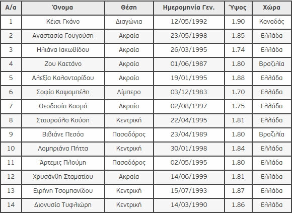 Ήρθαν: Κωνσταντίνα Δρακουλίδου (Π), Ναταλία Μεταξά (Κ), Αποστολία Νούσια (Α), Σίσσυ Αποστολίδου (Α), Άννα Καρπουζά (Δ), Σοφία Γκιαούρη (Λ), Αλίσια Πέριν (Κ), Εμίλια Μιλοβάνοβιτς (Π)