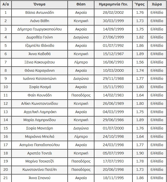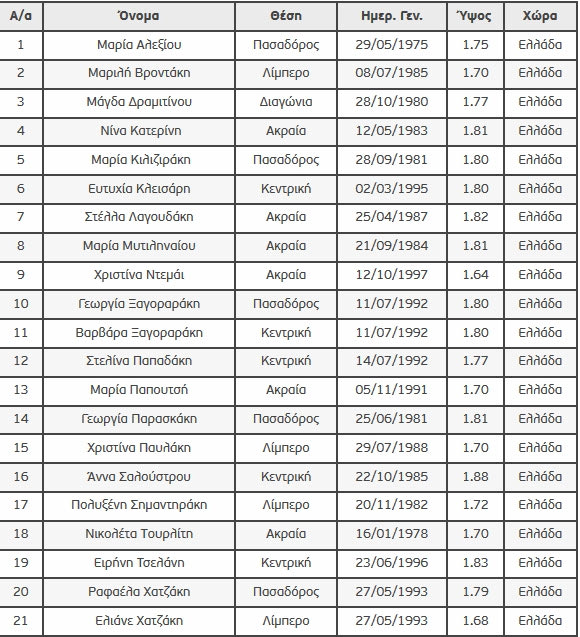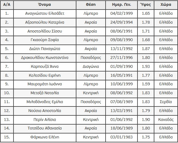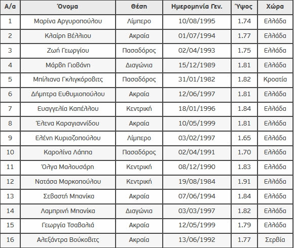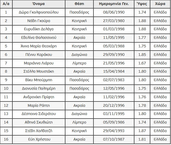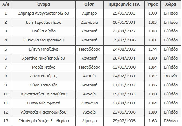 Ήρθαν: Σοφία Κοσμά (Α), Άννα Καβαθά (Κ), Αλίκη Κωνσταντινίδου (Κ), Μαρία Λαμπρινίδου (Κ), Μαρίνα Τσοχατζή (Π), Δήμητρα Γεωργακοπούλου (Α), Δωροθέα Γούνη (Δ), Θάνια Καραγιάννη (Α), Άννα Σπανού (Α)