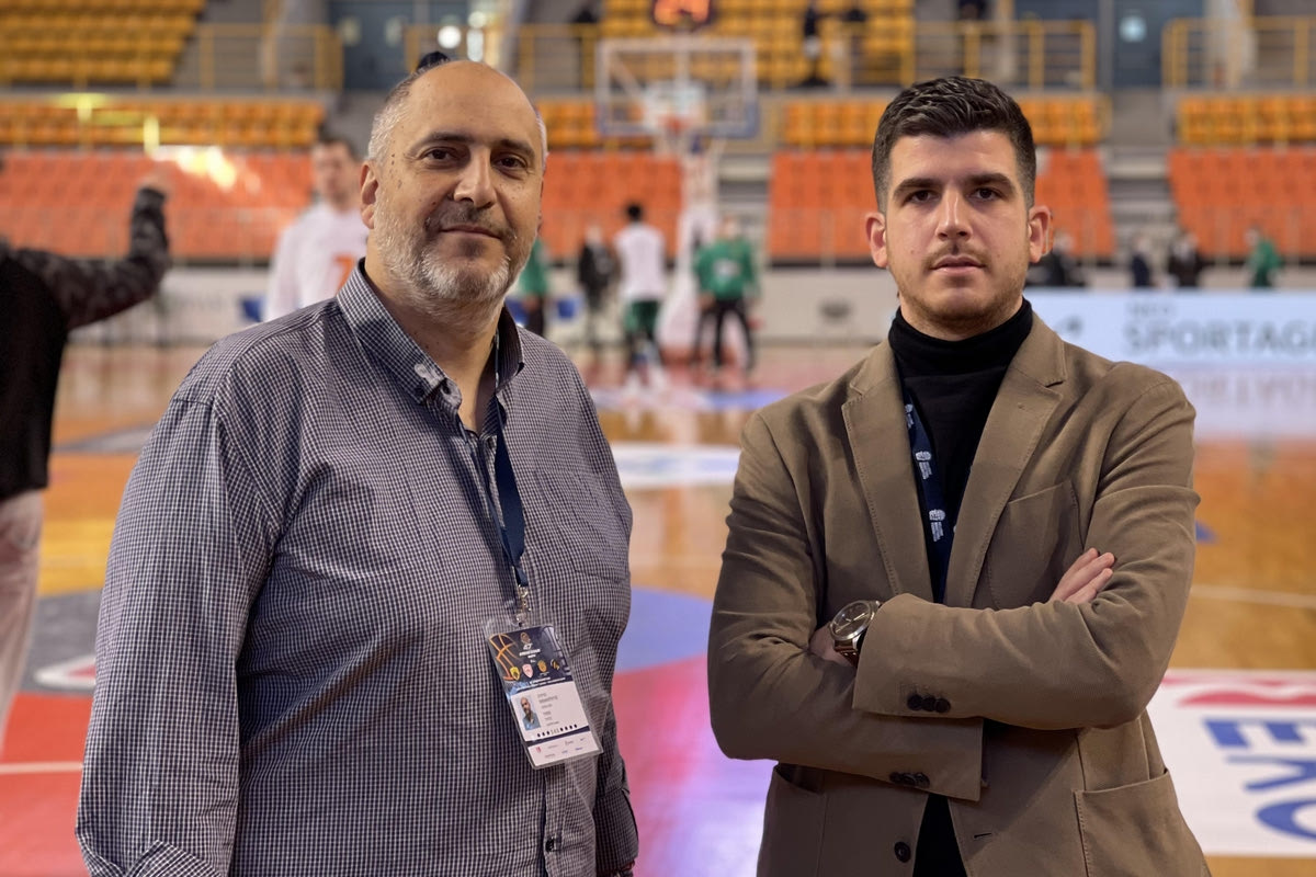 Ο Σπύρος Καβαλιεράτος και ο Αλέξανδρος Τρίγκας μεταφέρουν τα τελευταία νέα πριν από την έναρξη του πρώτου ημιτελικού του Final Four, ανάμεσα σε Προμηθέα και Παναθηναϊκό ΟΠΑΠ.